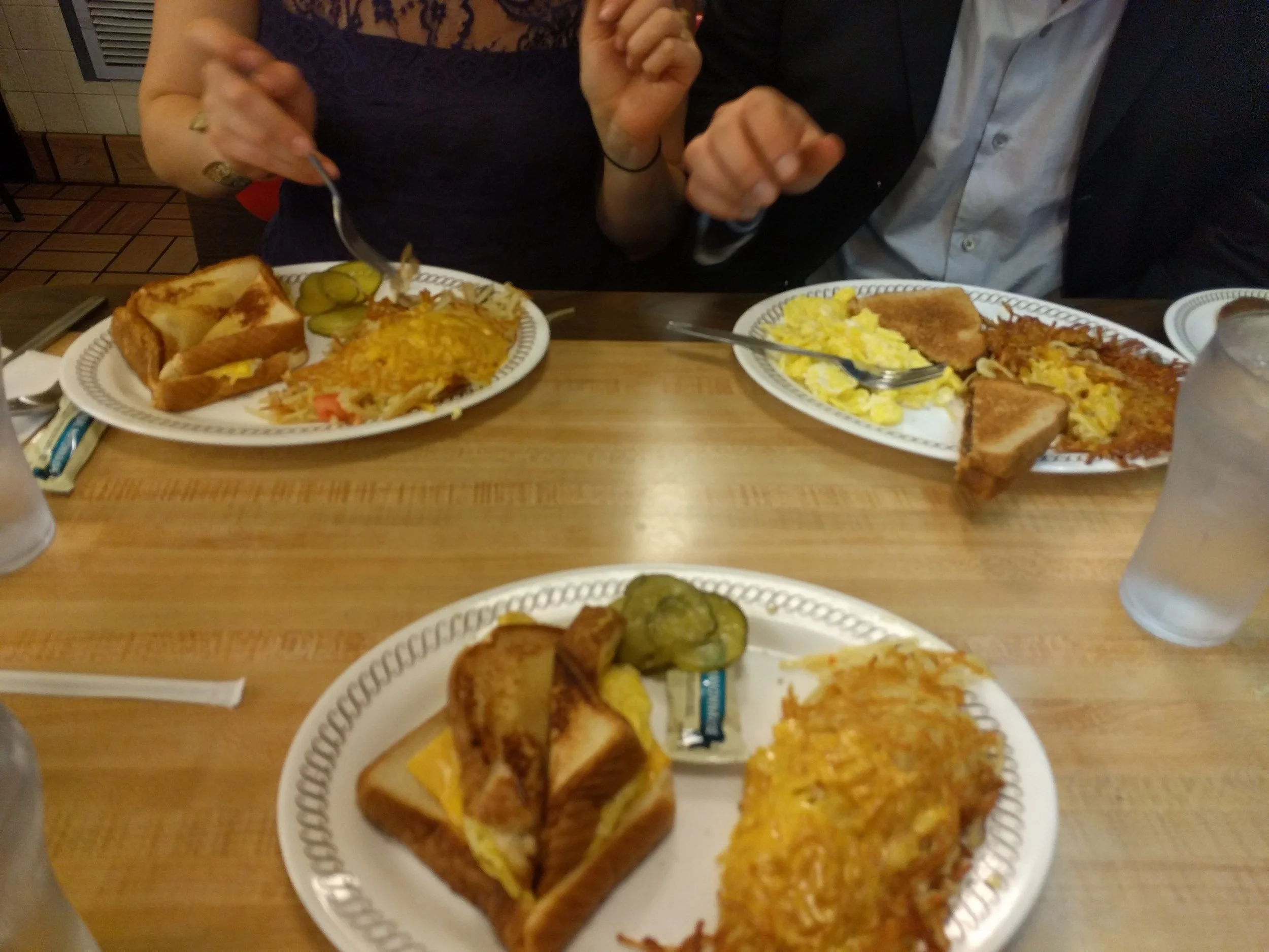 I traveled to Atlanta, Georgia for a diner meetup recently. I drove through the night and arrived in Atlanta just before sunrise. The fluorescents in gas stations hurt my eyes so I did not stop for snacks and found myself famished as I passed my 17th Waffle House. I believe all multiples of 7, not just 7 itself, are lucky numbers so I decided to stop.
